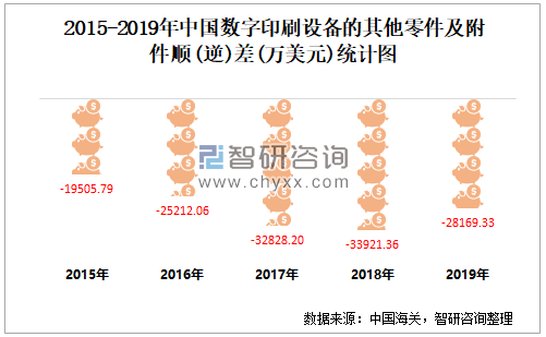 2015-2019年中国数字印刷设备的其他零件及附件顺(逆)差统计图
