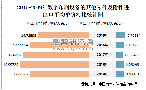 2015-2019年中国数字印刷设备的其他零件及附件进出口平均单价对比统计图