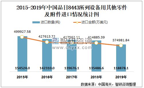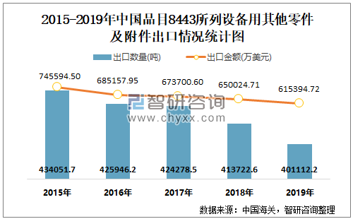 根据中国海关数据显示:2019年1-12月中国品目8443所列设备用其他零件及附件进口数量为118878.05吨,进口金额为374981.84万美元;2019年1-12月品目8443所列设备用其他零件及附件出口数量为401112.22吨,出口金额为615394.72万美元。