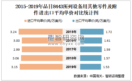 2015-2019年中国品目8443所列设备用其他零件及附件进出口平均单价对比统计图