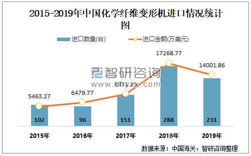根据中国海关数据显示:2019年1-12月中国化学纤维变形机进口数量为231台,进口金额为14001.86万美元;2019年1-12月化学纤维变形机出口数量为623台,出口金额为14877.85万美元。
