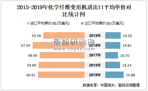 2015-2019年中国化学纤维变形机进出口平均单价对比统计图