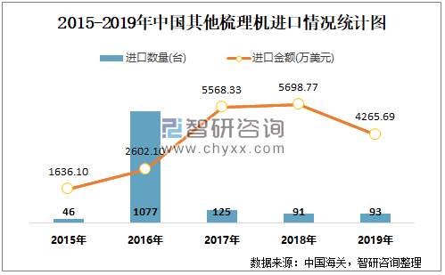 根据中国海关数据显示:2019年1-12月中国其他梳理机进口数量为93台,进口金额为4265.69万美元;2019年1-12月其他梳理机出口数量为1623台,出口金额为2474.37万美元。