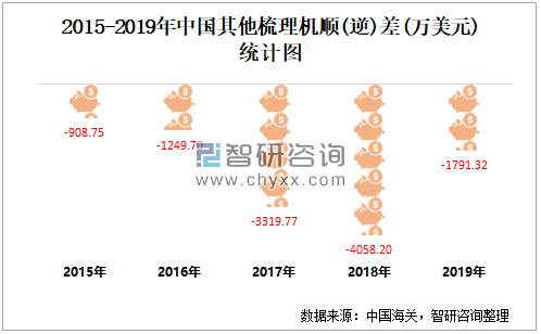 2015-2019年中国其他梳理机顺(逆)差统计图