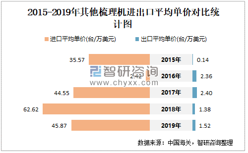 2015-2019年中国其他梳理机进出口平均单价对比统计图
