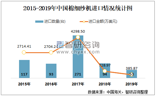 根据中国海关数据显示:2015-2019年中国棉细纱机进口数量与进口金额均在2017年达到最高值,此后快速下降;2015-2019年中国棉细纱机出口数量2019年达到最低值。