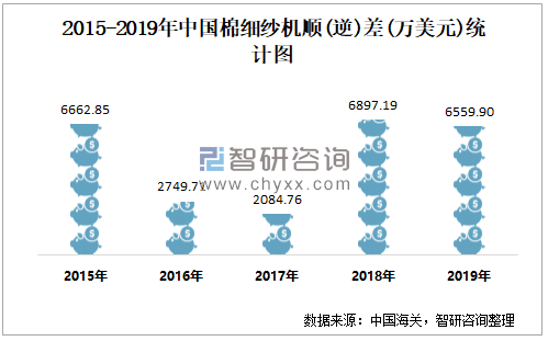 2015-2019年中国棉细纱机顺(逆)差统计图