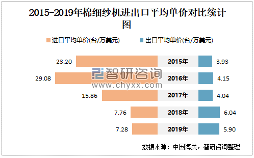 2015-2019年中国棉细纱机进出口平均单价对比统计图