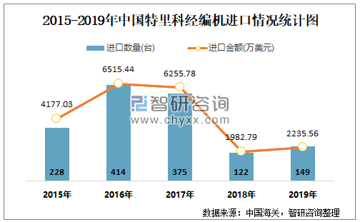 根据中国海关数据显示:2015-2019年中国特里科经编机进口数量与进口金额2016年达到最高值;2015-2019年中国特里科经编机出口数量与出口金额均在2018年达到最高值,此后快速下降。