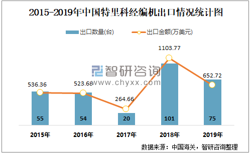 根据中国海关数据显示:2019年1-12月中国特里科经编机进口数量为149台,进口金额为2235.56万美元;2019年1-12月特里科经编机出口数量为75台,出口金额为652.72万美元。