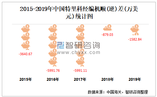 2015-2019年中国特里科经编机顺(逆)差统计图