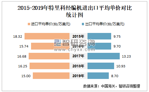 2015-2019年中国特里科经编机进出口平均单价对比统计图