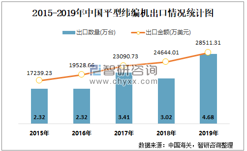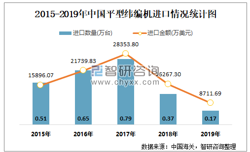 根据中国海关数据显示:2019年1-12月中国平型纬编机进口数量为0.17万台,进口金额为8711.69万美元;2019年1-12月平型纬编机出口数量为4.68万台,出口金额为28511.31万美元。