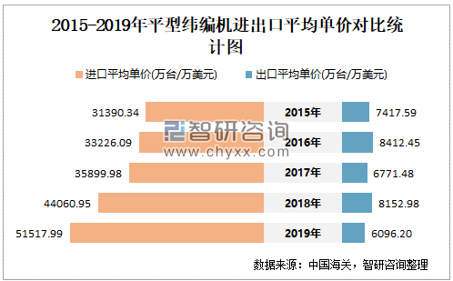2015-2019年中国平型纬编机进出口平均单价对比统计图