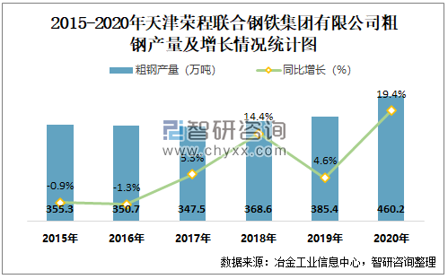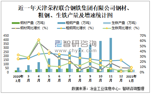 根据冶金工业信息中心数据显示:2020年1-12月天津荣程联合钢铁集团有限公司钢材产量为456.8万吨,同比增长21%,粗钢产量为460.2万吨,同比增长19.4%,生铁产量为407万吨,同比增长15.9%;2021年1月天津荣程联合钢铁集团有限公司钢材产量为34万吨,同比增长7.9%,粗钢产量为34.9万吨,同比增长9.6%,生铁产量为30.2万吨,同比增长3.3%。