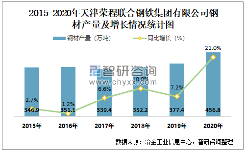 2015-2020年天津荣程联合钢铁集团有限公司钢材产量及增长情况统计图
