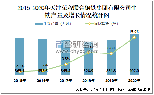 2015-2020年天津荣程联合钢铁集团有限公司生铁产量及增长情况统计图