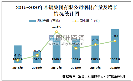 2015-2020年本钢集团有限公司钢材产量及增长情况统计图
