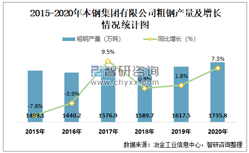 根据冶金工业信息中心数据显示:2020年1-12月本钢集团有限公司钢材产量为1663万吨,同比增长5%,粗钢产量为1735.8万吨,同比增长7.3%,生铁产量为1732.6万吨,同比增长9%;2021年1月本钢集团有限公司钢材产量为144.5万吨,同比下降4.62%,粗钢产量为154.7万吨,同比下降1.22%,生铁产量为151万吨,同比下降2.37%。