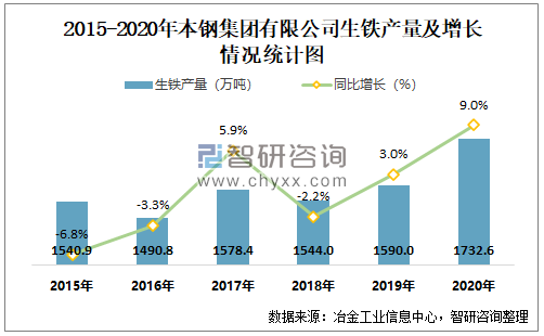 2015-2020年本钢集团有限公司生铁产量及增长情况统计图