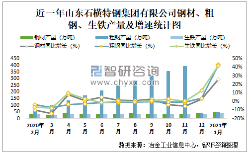 根据冶金工业信息中心数据显示:2020年1-12月山东石横特钢集团有限公司钢材产量为432.6万吨,同比下降0.71%,粗钢产量为421.7万吨,同比增长1.3%,生铁产量为363.5万吨,同比增长0.9%;2021年1月山东石横特钢集团有限公司钢材产量为46.5万吨,同比增长25.9%,粗钢产量为50.6万吨,同比增长43%,生铁产量为43万吨,同比增长42%。