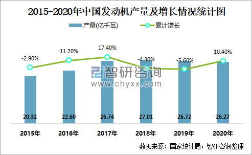 2015-2020年中国发动机产量及增长情况统计图