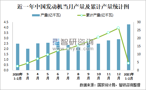根据国家统计局数据显示:2021年1-2月中国发动机累计产量为4.3亿千瓦,累计增长89.4%;2015-2020年中国发动机产量2018年达到最高,此后逐年递减。