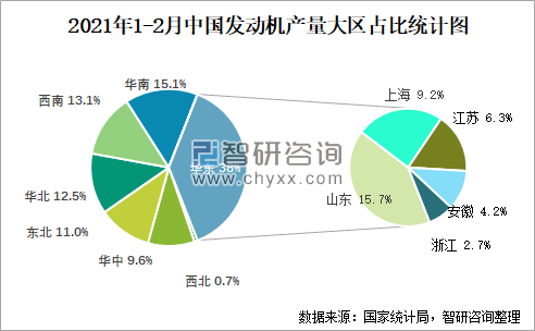 2021年1-2月中国发动机产量大区占比统计图