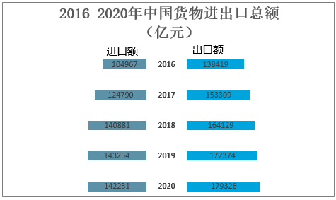 2016-2020年中国货物进出口总额