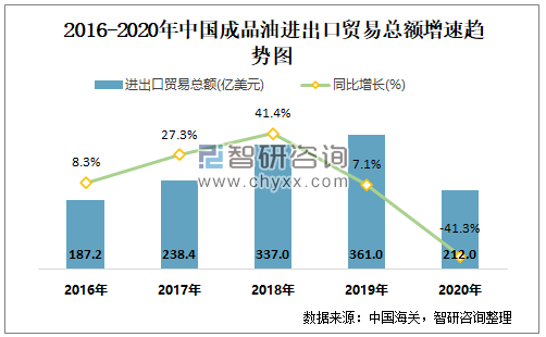 2016-2020年中国成品油进出口贸易总额及增速趋势图