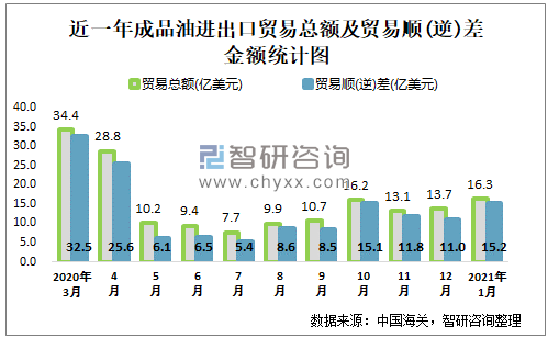 近一年中国成品油进出口贸易总额及贸易顺(逆)差统计表