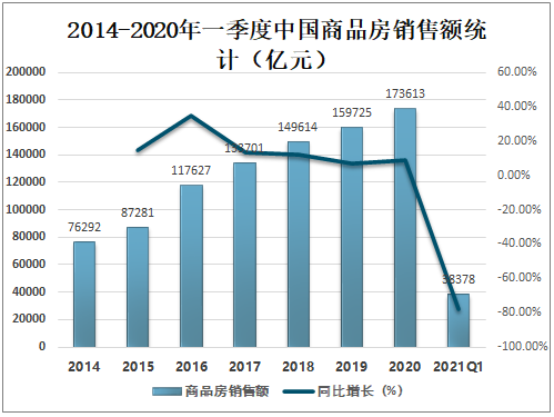 随着中国商品房销售面积的增加,销售额也随着增长,2020年中国商品房销售额达173613亿元,较2019年增加了13887.88亿元,同比增长8.69%,2020年一季度中国商品房销售额已完成38378亿元。