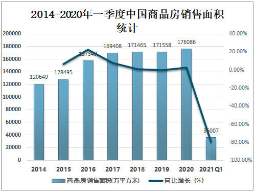 自2015年以来中国商品房销售面积平稳增长,2020年中国商品房销售面积达176086万平方米,较2019年增加了4528.13万平方,同比增长2.64%,2020年一季度中国商品房销售面积已完成36007万平方米。