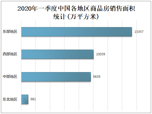 2020年一季度中国东部地区商品房销售面积为15347万平方米,占全国商品房销售总面积的42.62%,占比最大;西部地区商品房销售面积为10039万平方米,占全国商品房销售总面积的27.88%;中部地区商品房销售面积为9639万平方米,占全国商品房销售总面积的26.77%;东北地区商品房销售面积为981万平方米,占全国商品房销售总面积的2.72%。