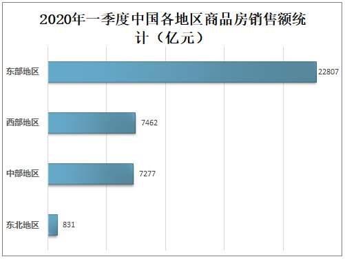 2020年一季度中国东部地区商品房销售额为22807亿元,占全国商品房销售总额的59.43%,占比最大;西部地区商品房销售额为7462亿元,占全国商品房销售总额的19.44%;中部地区商品房销售额为7277亿元,占全国商品房销售总额的18.96%;东北地区商品房销售额为831亿元,占全国商品房销售总额的2.17%。