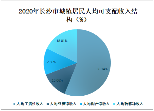 2020年长沙市城镇居民人均工资性收入为32543元,占长沙市城镇居民人均可支配总收入的56.14%,占比最大;人均经营净收入为7569元,占长沙市城镇居民人均可支配总收入的13.06%;人均财产净收入为7420元,占长沙市城镇居民人均可支配总收入的12.80%;人均转移净收入为10439元,占长沙市城镇居民人均可支配总收入的18.01%。