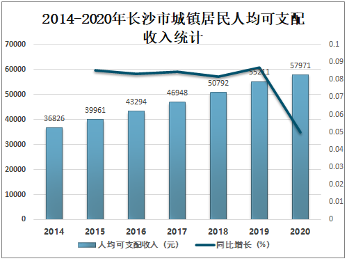 近年来长沙市城镇居民人均可支配收入逐年增加,2020年长沙市城镇居民人均可支配收入达57971元,较2019年增加了2760元,同比增长5.0%。