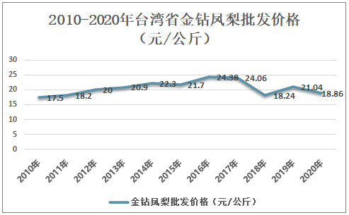 2019年台湾省主要品种之一金钻凤梨批发价格为21.04台币/公斤,2020年批发价格为18.65台币/公斤。