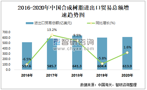 2016-2020年中国合成树脂进出口贸易总额及增速趋势图