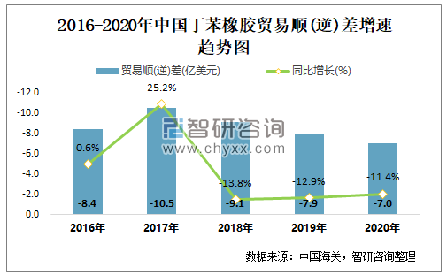 2016-2020中国丁苯橡胶贸易顺(逆)差及增速趋势图
