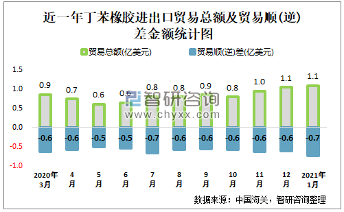 近一年中国丁苯橡胶进出口贸易总额及贸易顺(逆)差统计表