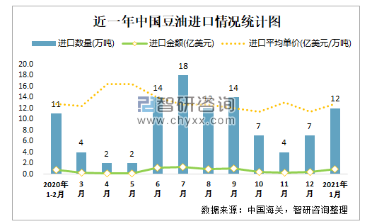 根据中国海关数据显示:2021年1月中国豆油进口数量为12万吨,同比增长51.7%,进口金额为0.92亿美元,同比增长54.7%;近一年中国豆油进口均价存在小幅度涨跌,1月进口均价高于2020年12月;2015-2020年中国豆油进口数量与进口金额均在2020年达到最高值。