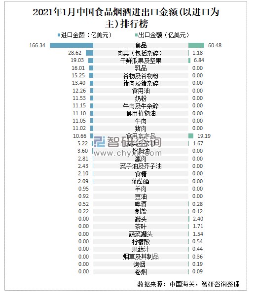 2021年1月中国食品烟酒进出口金额(以进口为主)排行榜