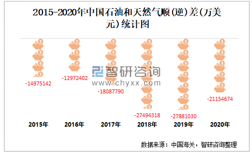 2015-2020年中国石油和天然气顺(逆)差(万美元)统计图