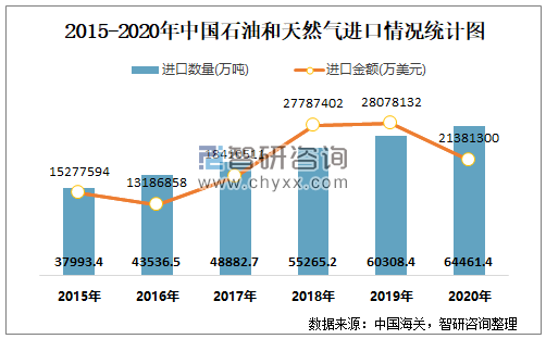 2015-2020年中国石油和天然气进口情况统计图