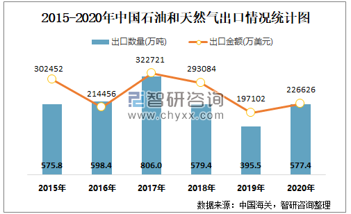 2015-2020年中国石油和天然气出口情况统计图