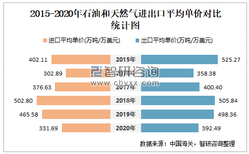 2015-2020年石油和天然气进出口平均单价对比统计图