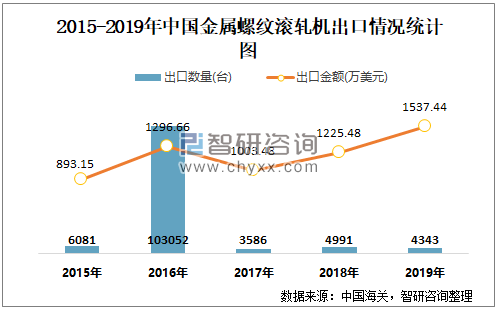 2015-2019年中国金属螺纹滚轧机出口情况统计图