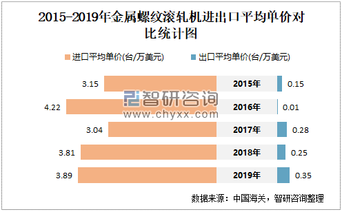 2015-2019年中国金属螺纹滚轧机进出口平均单价对比统计图