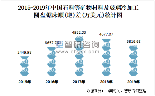 2015-2019年中国石料等矿物材料及玻璃冷加工圆盘锯床顺(逆)差统计图